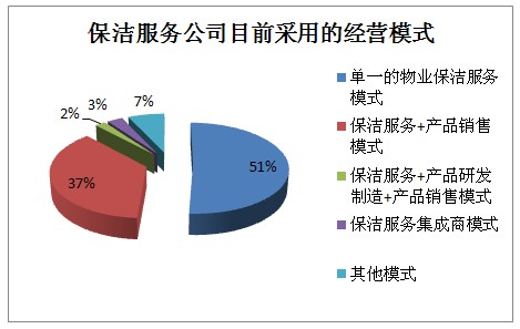 現(xiàn)階段,大部分的物業(yè)保潔公司還是采用專業(yè)化單一的保潔服務發(fā)展模式,在這物業(yè)保潔的市場里不斷發(fā)展壯大,逐漸形成了保潔服務高度專業(yè)化的競爭優(yōu)勢。調查結果顯示:單一的物業(yè)保潔服務模仍被采用的企業(yè)占51%,保潔服務+產(chǎn)品銷售的發(fā)展模式占37%,是目前物業(yè)保潔服務公司的兩大經(jīng)營模式。
